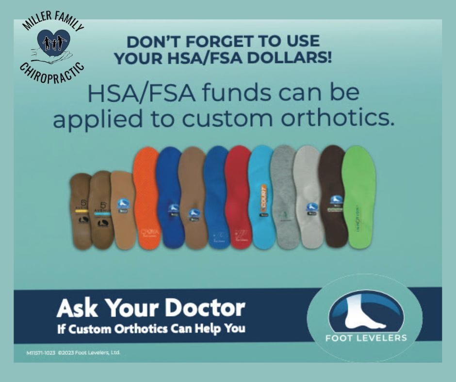 Wanting a custom made pair of orthotics? You can apply your HSA/FSA dollars to purchase a pair of custom orthotics! Ask Dr. Miller if custom made orthotics would benefit you and help hold your adjustments longer!