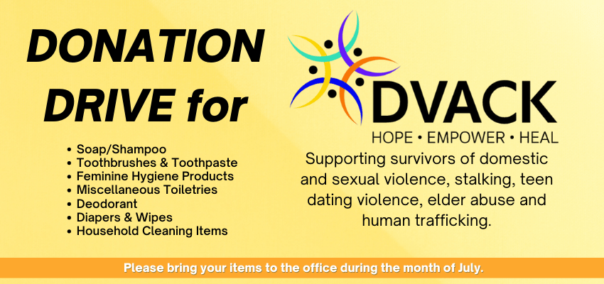 This month we are collecting donations for DVACK. All items will go to support survivors in the Salina area. Please bring your donations of non-perishable goods and personal items to the office during regular business hours. Thank you for supporting this truly life-changing organization.