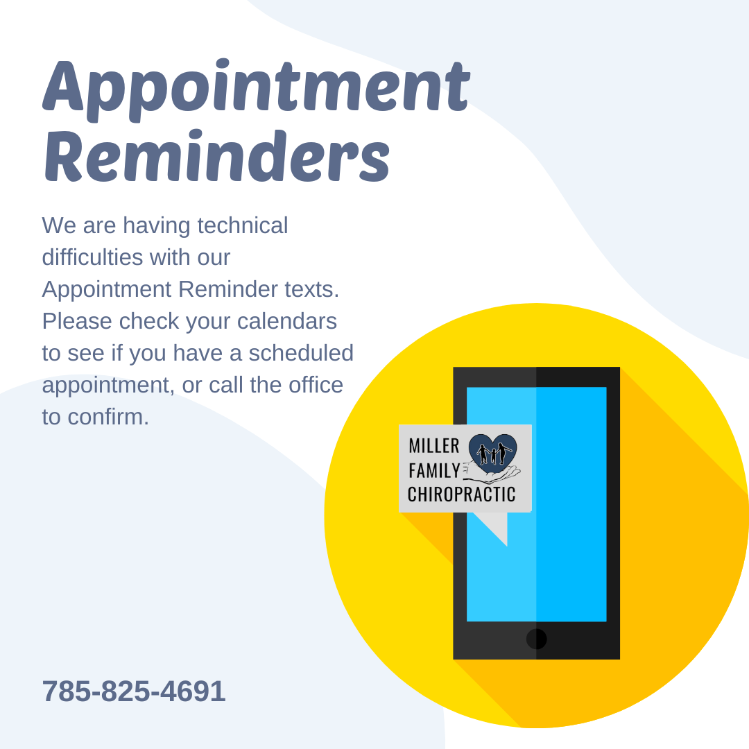 Our Patient Reminder text system is misbehaving and not sending out messages. We are working to fix the issue, but in the meantime please put those reminders on your calendars. If you are unsure about any upcoming appointments please call the office and we can check the schedule, 785-825-4691.