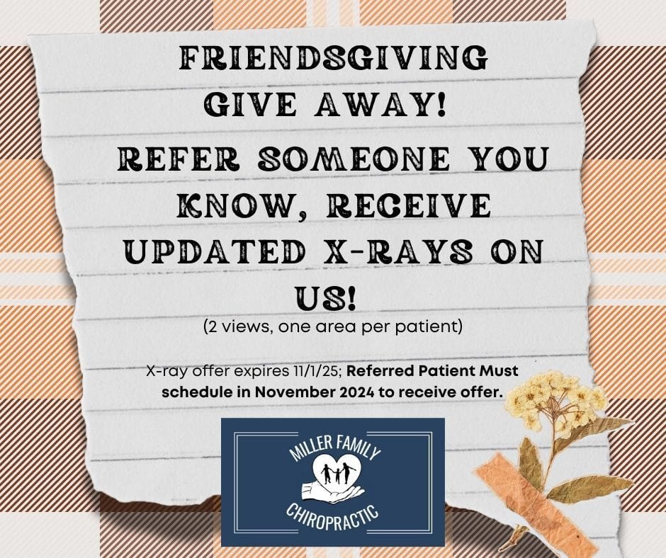 Refer someone you know, receive a 2-view X-ray on us. Hurry, referred patient must schedule in November. Request an appointment here: https://www.millerfamilychiropractic.com/request-an-appointment/